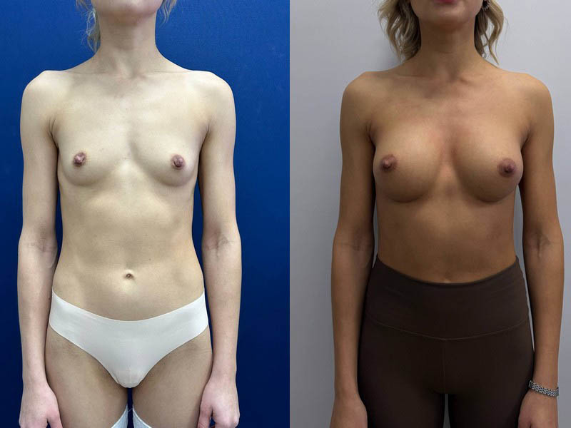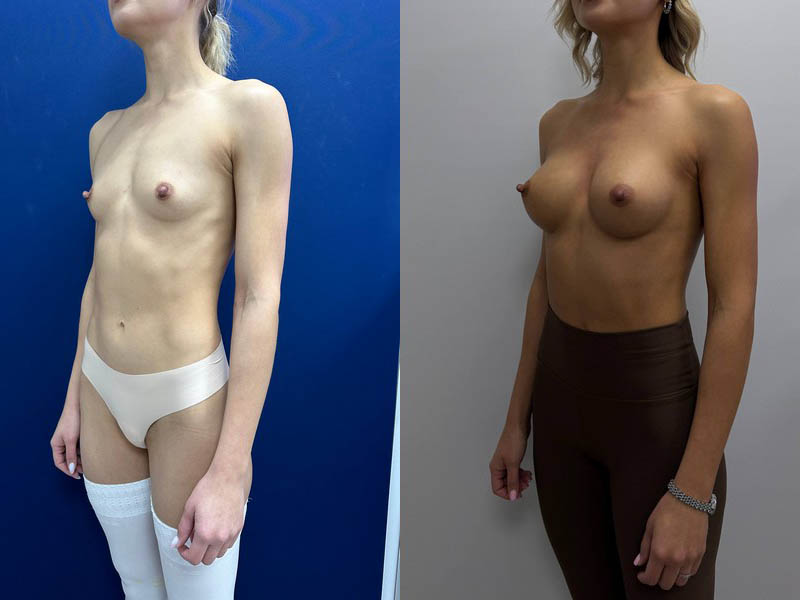 Увеличение груди круглыми имплантами с симметризирующим липофилингом (в одном наркозе также выполнена верхняя блефаропластика)